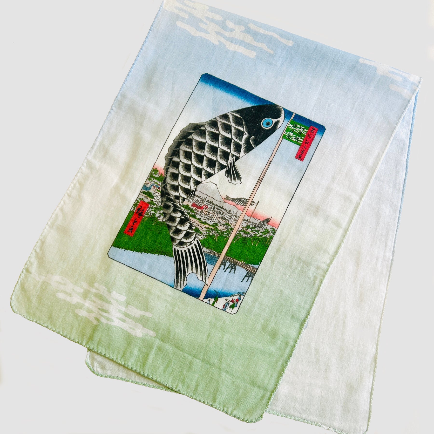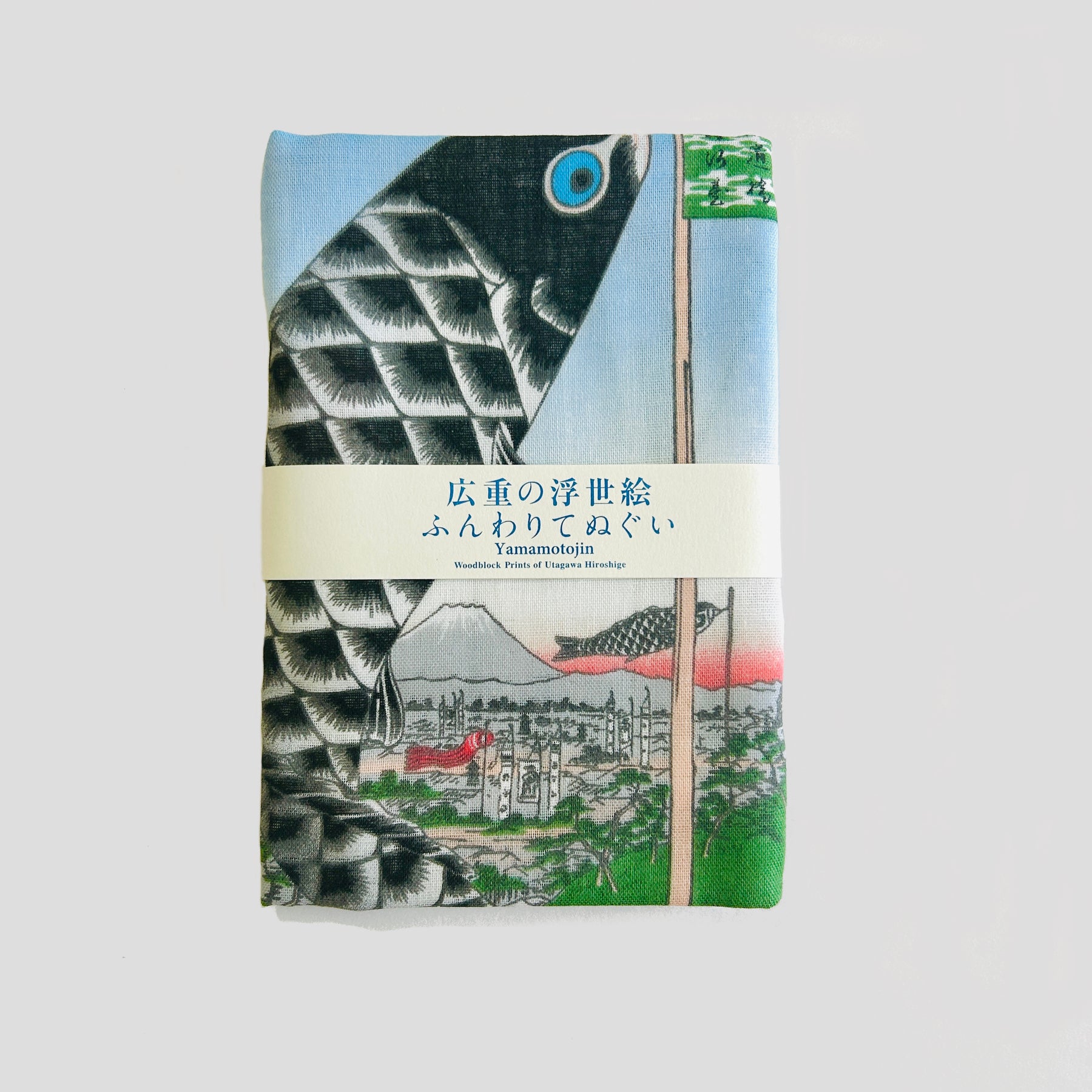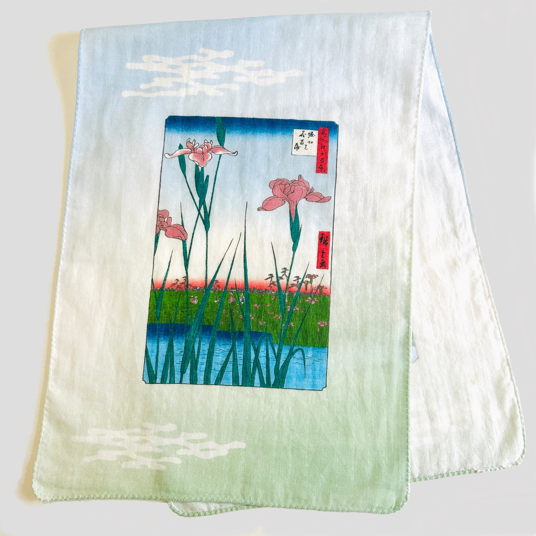 The design of this tenugui is by Utagawa Hiroshige, one of the great masters of the ukiyo-e who had a significant impact on the French Impressionists. One side of this tenugui shows a carp-shaped windsock which is displayed in spring to wish healthy growth of children. The other side depicts a field of iris which bloom around the same time.