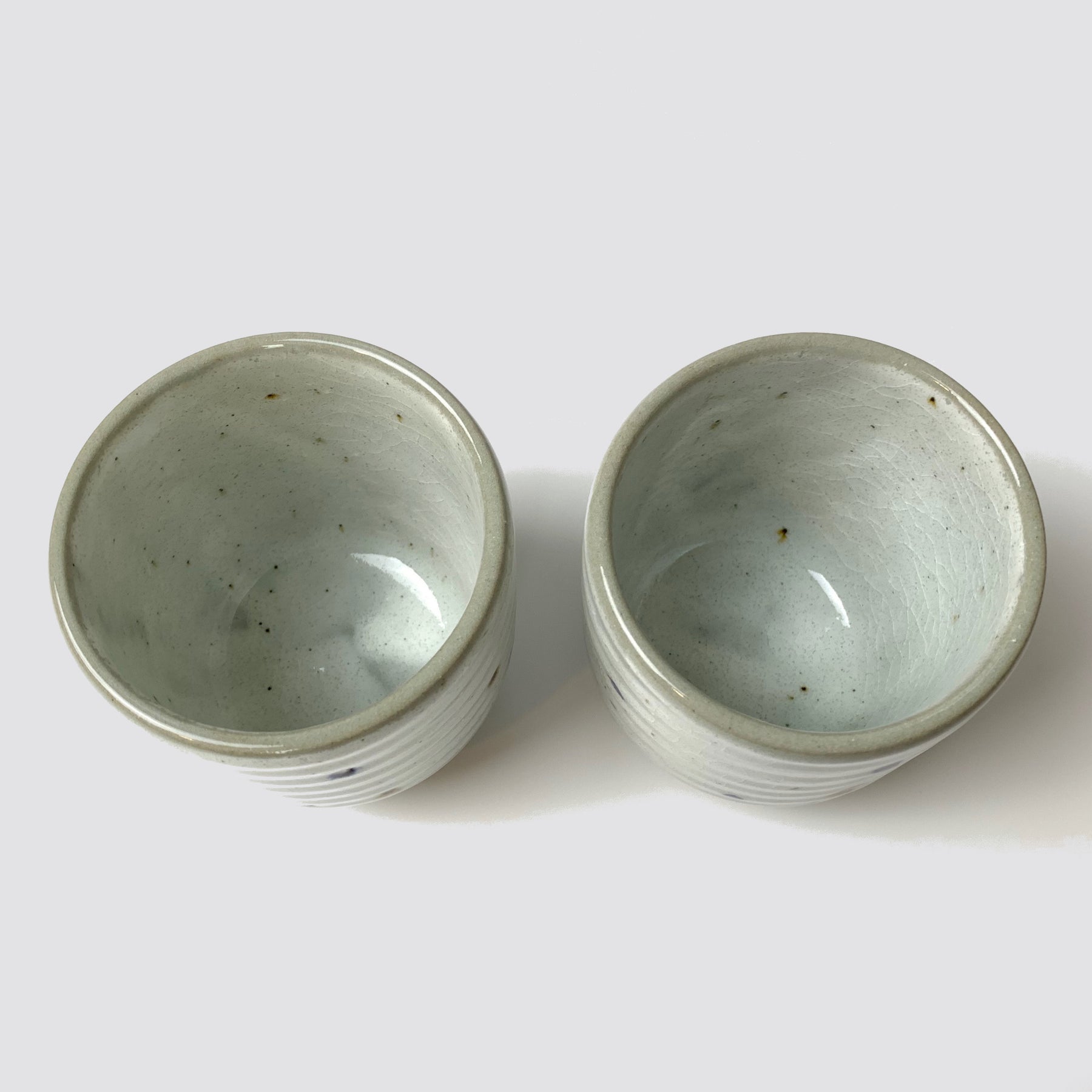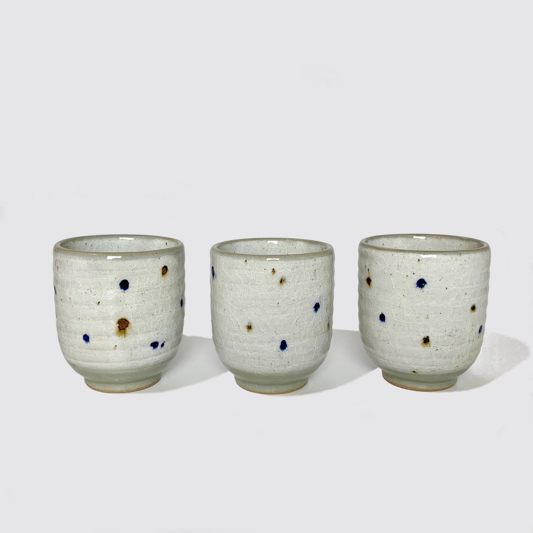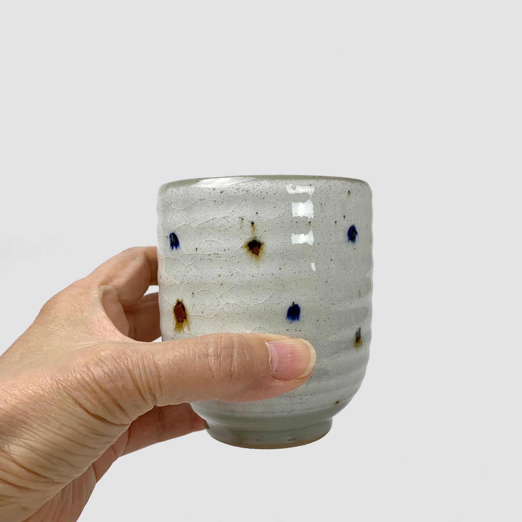 Our sushi yunomi are adorned with random splashes of brown and dark blue dots on a crazed surface. Each cup has a unique pattern, which, together with the light crazing, provides a warm, rustic touch. Crazing is one of the most popular techniques used in Japanese pottery